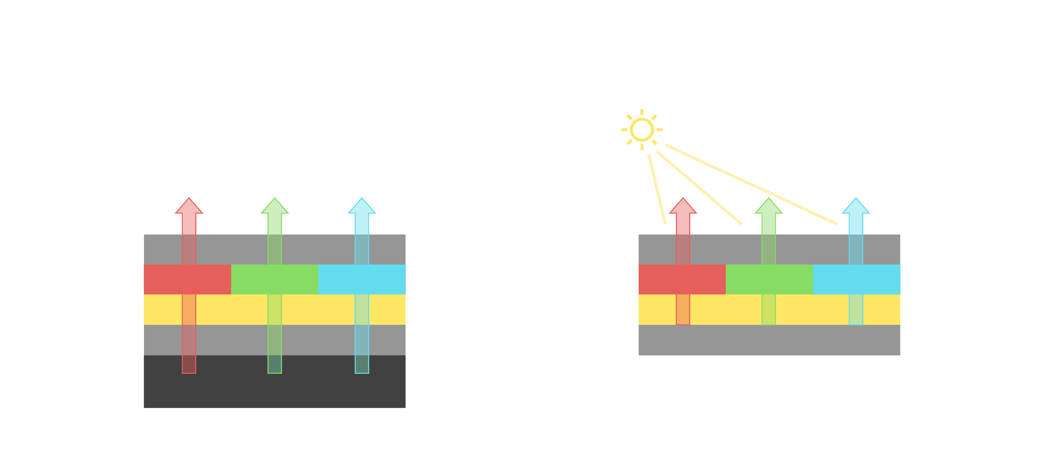 与传统需搭配背光单元的液晶显示相比,,,反射式液晶技术不仅更省电、、、、更轻薄,,,,且即便在艳阳下仍能清晰显示。。。。此外,,,少了背光单元,,,也大幅降低了 LED 蓝光伤害眼睛的疑虑。。。。